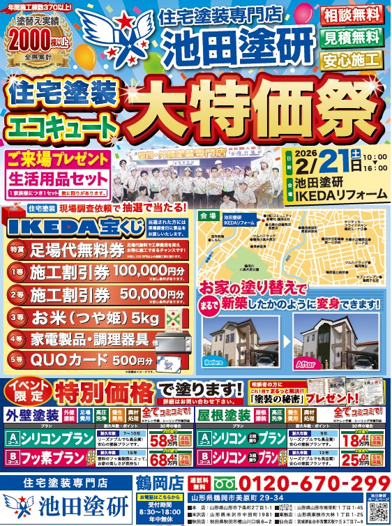 【山形県内施工棟数No.1】池田塗研は自社職人施工にこだわった住宅塗装専門店です。外壁屋根 無料診断、雨漏り修理、リフォーム補助金などお気軽にご相談ください。