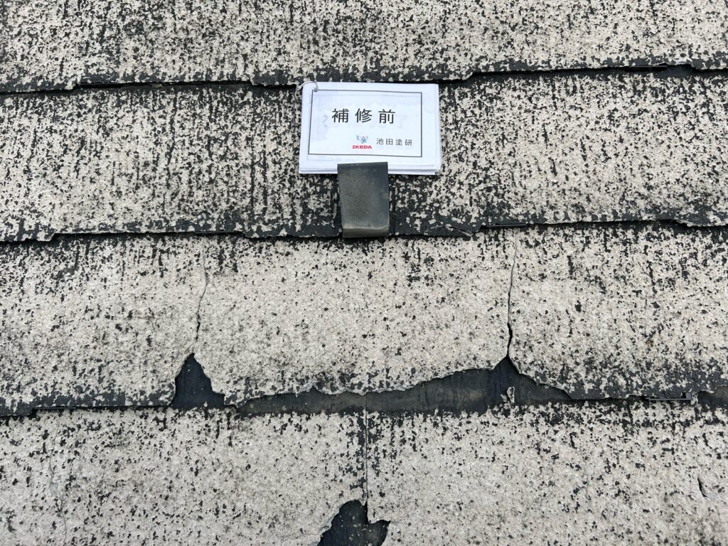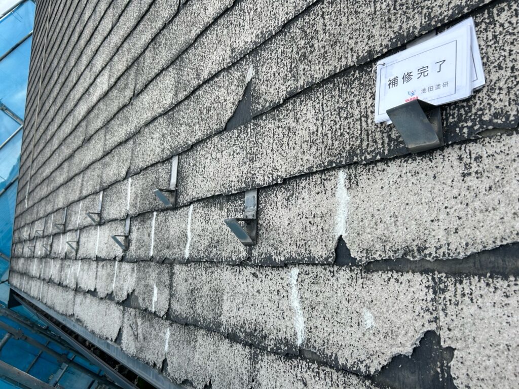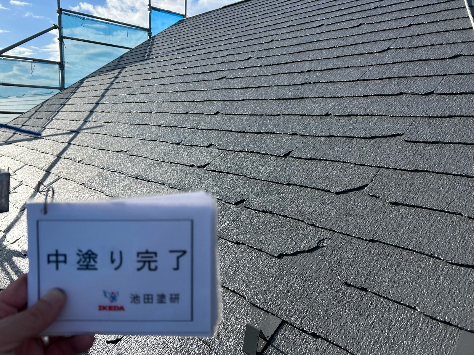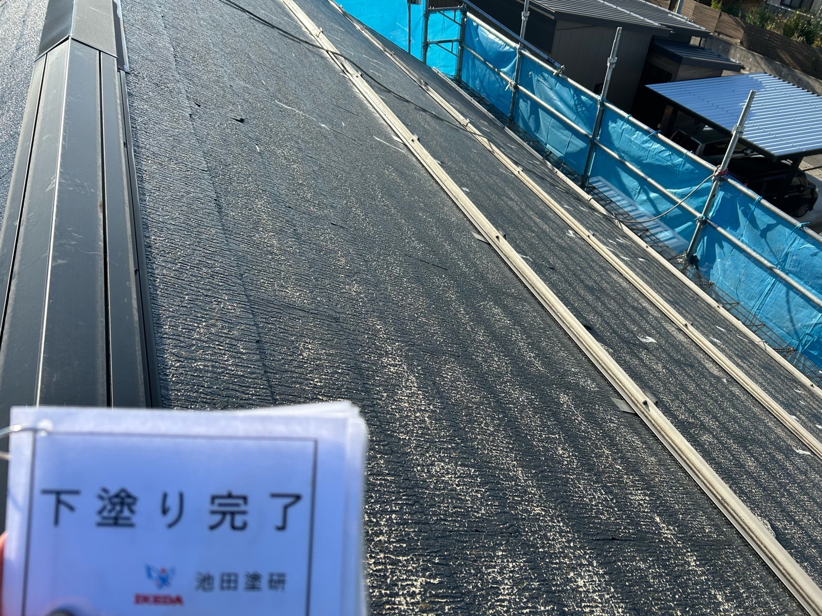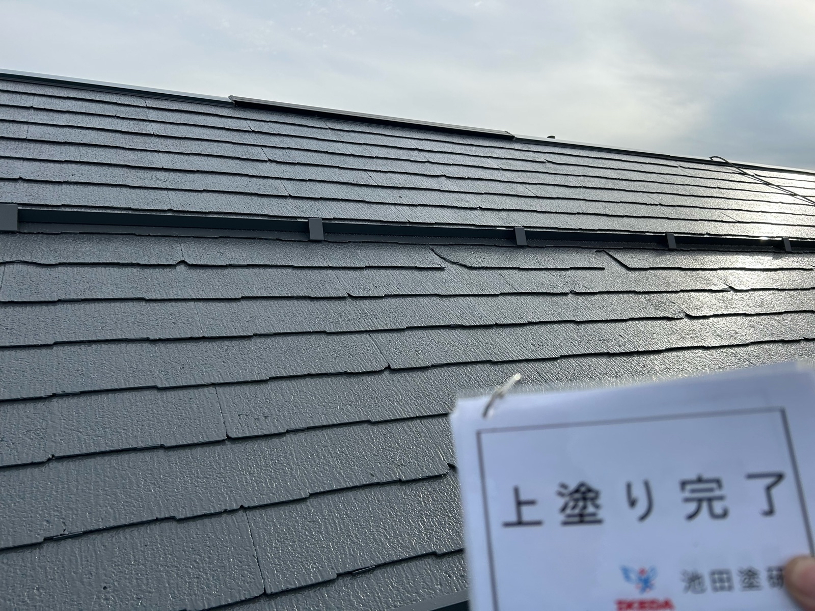スレート屋根特有のひび割れが数カ所にありました💥洗浄後にコーキングで補修して対応しています。 充分な下塗りをした後に「アイアングレー」の上塗り2回です❗外壁1階は「ナスコン」、2階は「SC-09」破風板や雨樋の色も変わって、大きくイメージチェンジしました😮👏屋根からの落雪での破損を防ぐため、サンルームの上には雪止めくんも設置しました❗